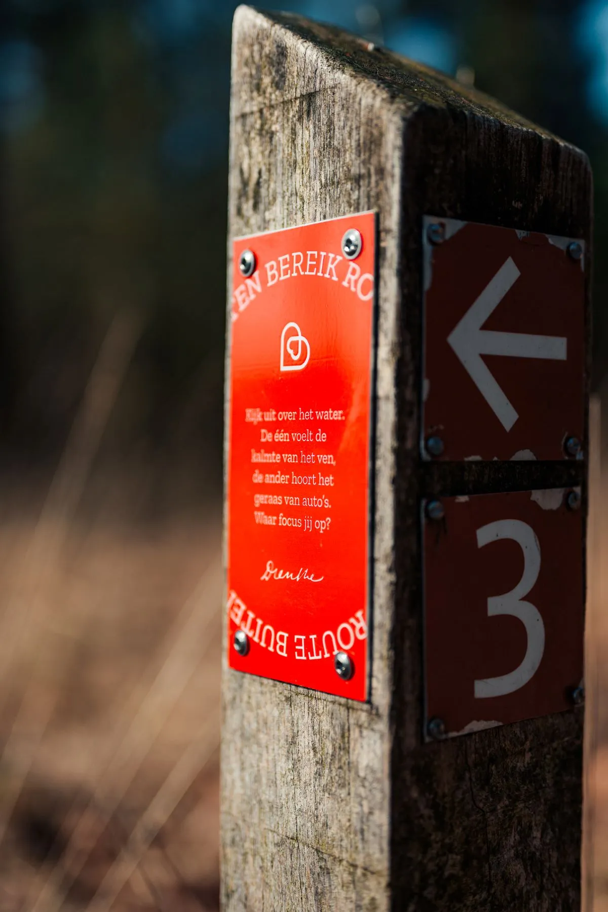 Het concept van de ‘Buiten Bereik’-wandelroutes is simpel maar doeltreffend. Je wandelt een aantal kilometer door de natuur. Onderweg word je niet geleid door een app, maar door speciale routebordjes. Geen bordjes die enkel de weg wijzen, maar bordjes met korte vragen en reflecties. Deze zijn bedoeld om je zintuigen te activeren en je anders naar de omgeving te laten kijken.