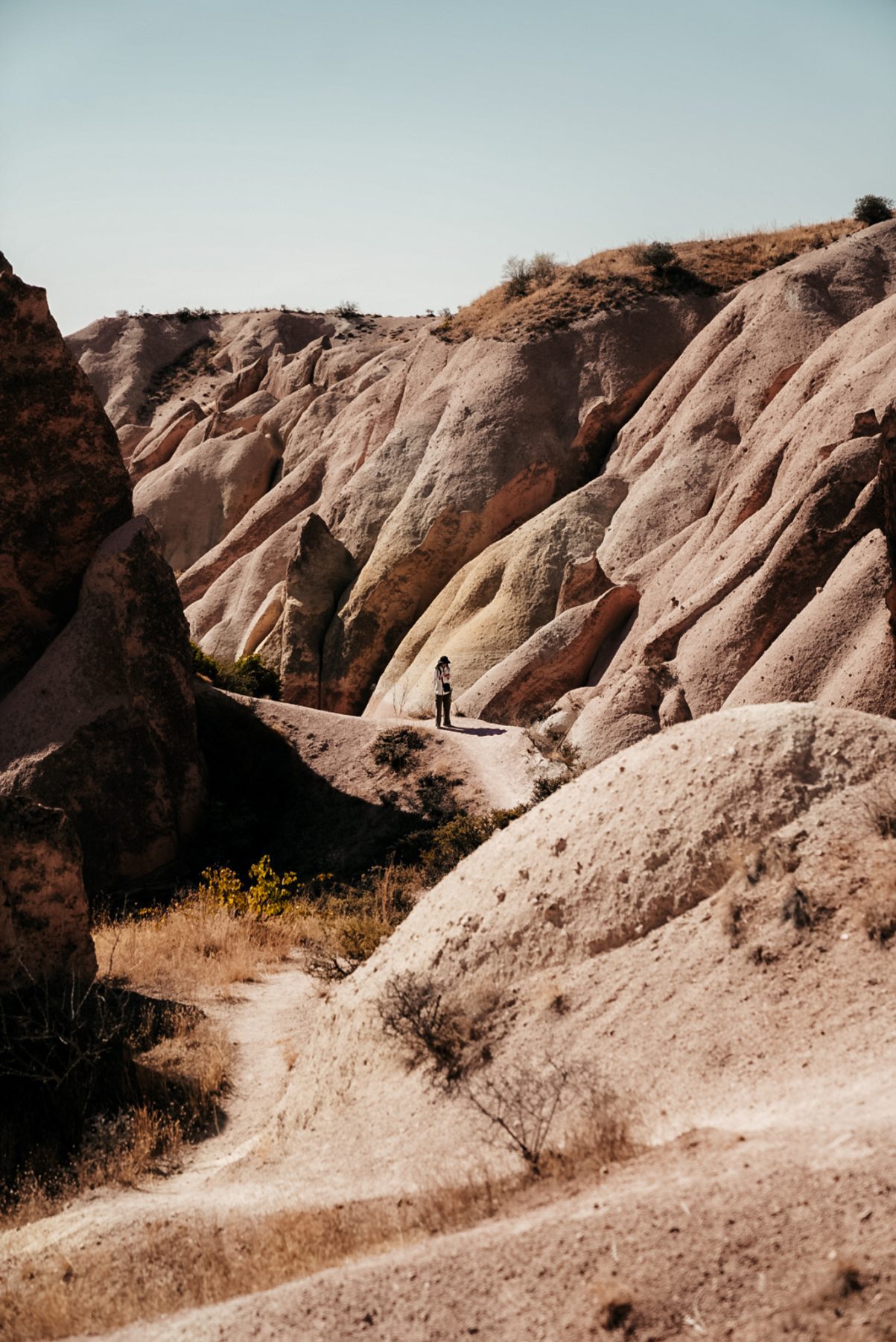 Het stuk daarna loop ik alleen. Ik ben nogal traag omdat ik veel foto’s maak, maar ik geniet van het alleen zijn. Vandaag lopen we door de Pink en Red Valley, een van de mooiste delen van The Cappadocia Trail. Onderweg kom je langs kleine, authentieke plekjes waar je even kunt neerploffen voor een Turkse koffie. We lopen door grotten waar het licht prachtig naar binnen valt, en over paden die zich kronkelen tussen de ronde vormen van de bergen. Soms lijken de rotsen wel van softijs gemaakt, zo bijzonder van vorm.