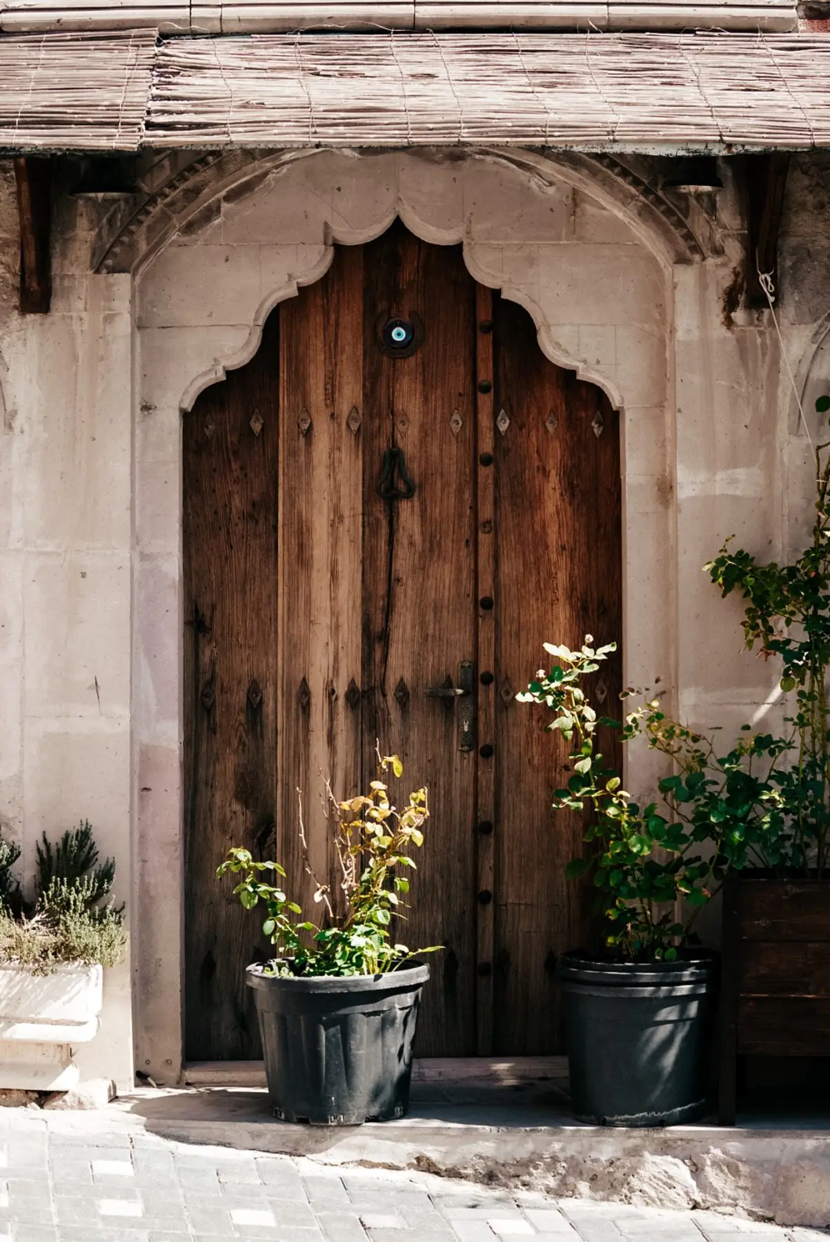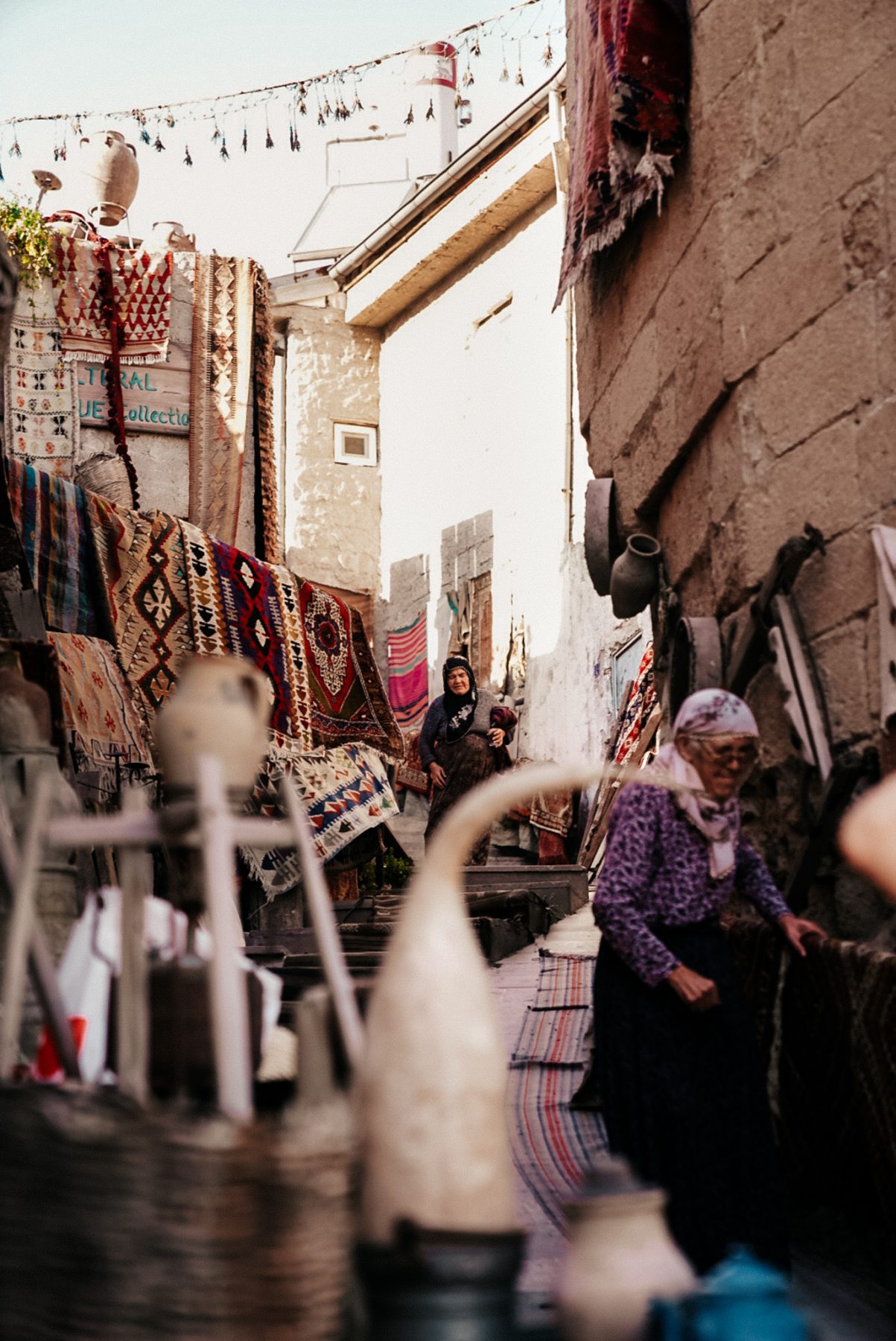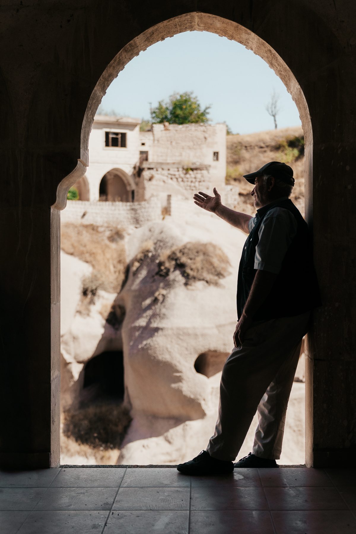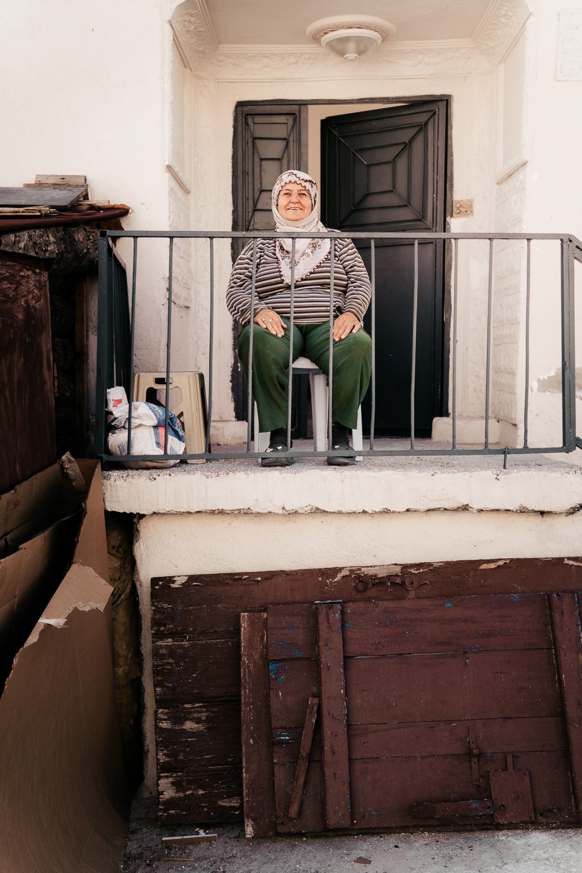 Nog maar net buiten Ortahisar trekt een Turkse vrouw mijn aandacht. Ze zit bij haar voordeur, rustig in ochtendzon. Ik vraag of ik een foto van haar mag maken. Ze glimlacht breed, fatsoeneert snel haar hoofddoek en poseert trots. Als ik haar de foto laat zien, pakt ze mijn hand en neemt me mee naar binnen. Ze drukt me een armband met een blauw oog in de hand. Het nazar boncuğu, een Turks symbool dat beschermt tegen het boze oog en geluk brengt. Dit lieve en pure gebaar raakt me en ik geef haar een knuffel om te bedanken. Weer zo’n onverwacht magisch moment onderweg.