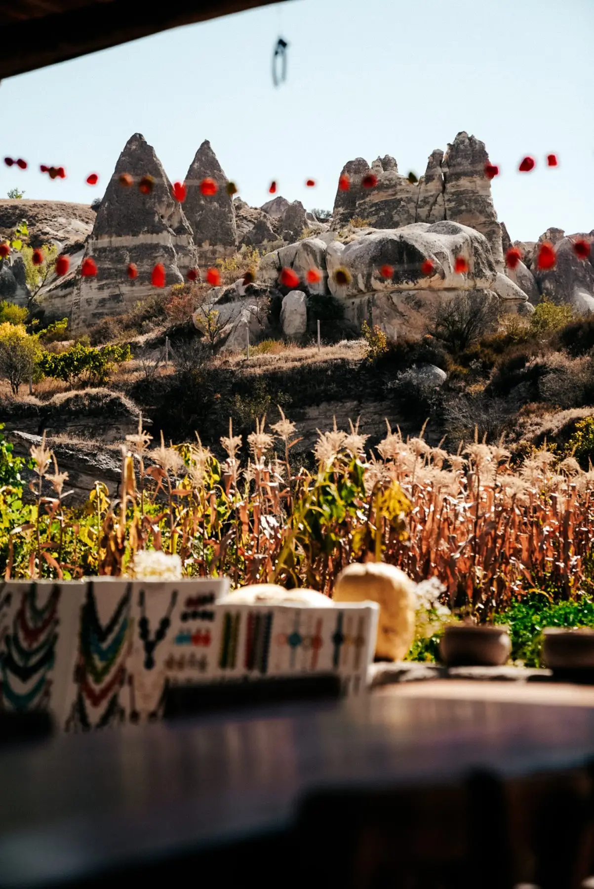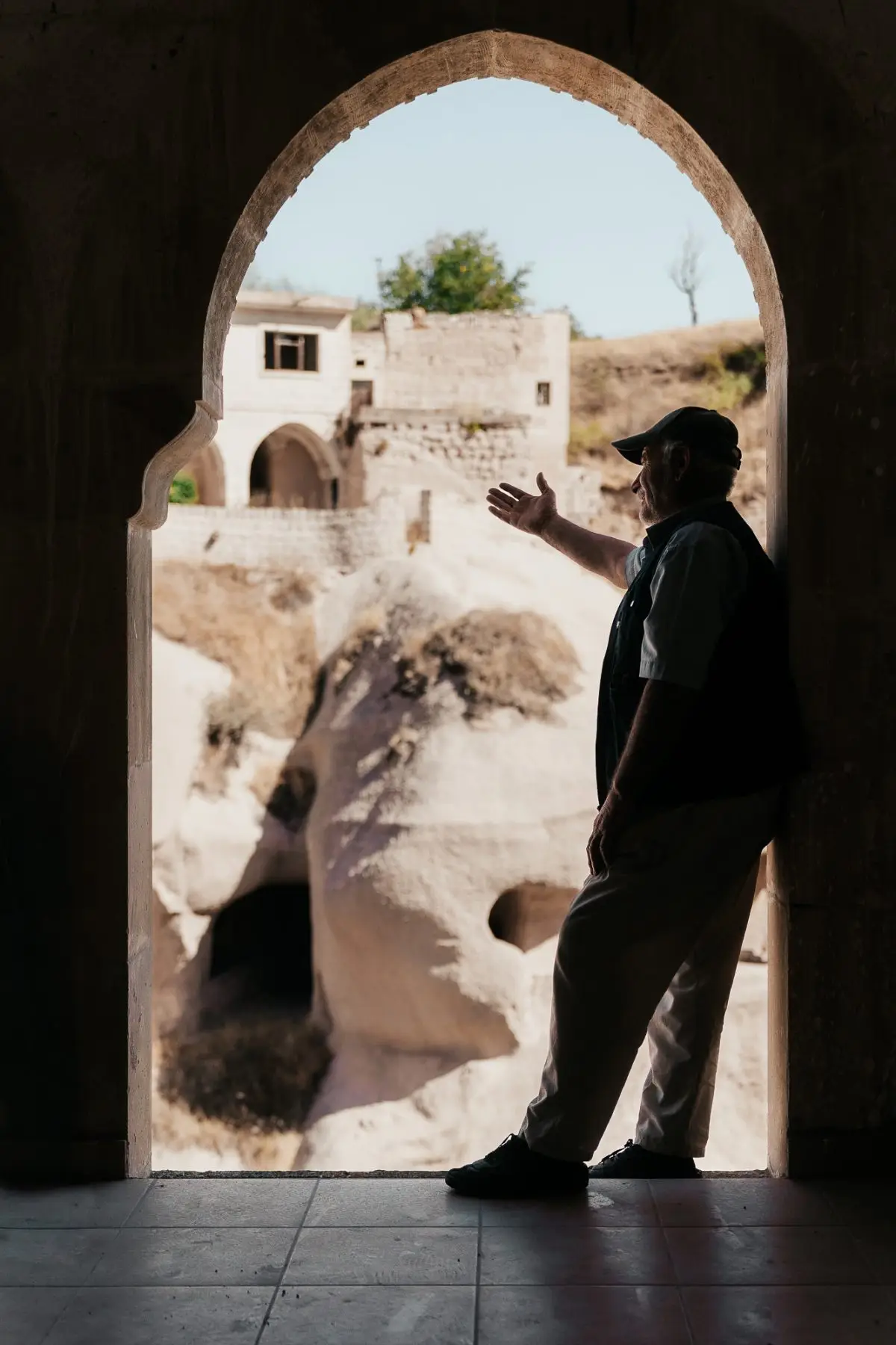 Vlak voor we Göreme bereiken, wandelen we naar een uitkijkpunt waar de Turkse vlag wappert in de wind. Op de achtergrond klinkt de adhan, de gebedsoproep. Vanaf hier zien we Göreme liggen, gebouwd tussen de rotsen, en dat uitzicht maakt alles goed.