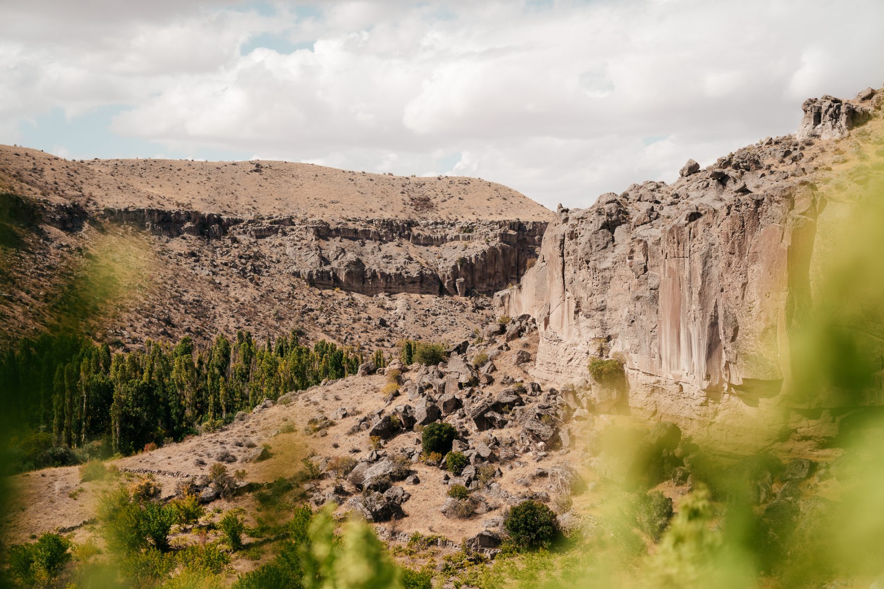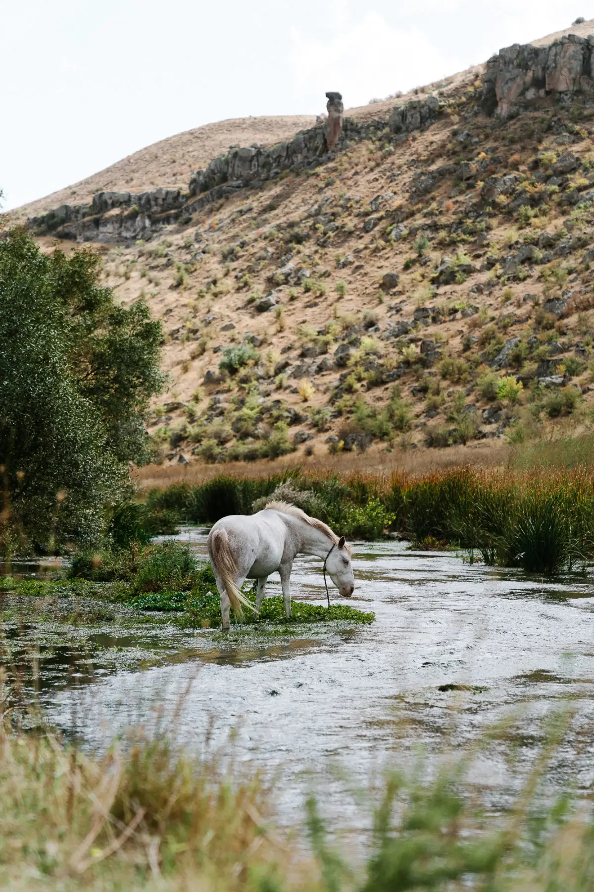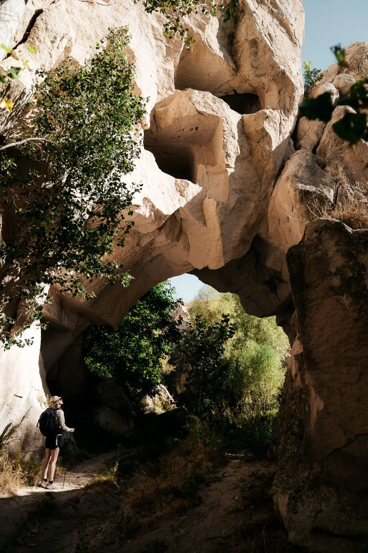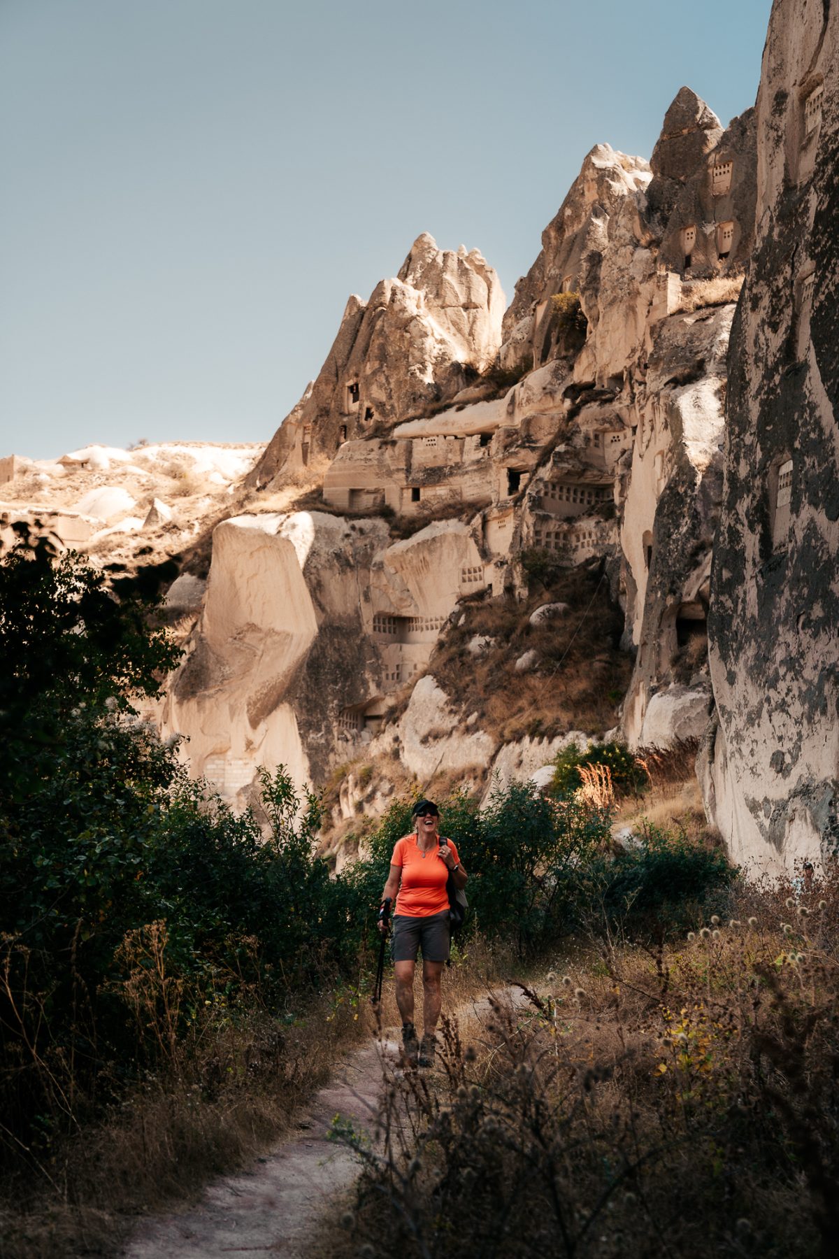De eerste kilometers lopen we langs een rivier, door een groene oase van rust. Maar eerlijk gezegd had ik op dat moment niet zo veel zin om te wandelen. Vijf dagen intensieve wandelingen hadden me al veel moois laten zien. Gelukkig wordt het al snel indrukwekkender: we lopen tussen steile rotswanden, zien paarden in de rivier en passeren Turkse vrouwen die het land bewerken of waterkers oogsten. De wandeling eindigt bij de Selime kathedraal, een klooster uit de 8e eeuw, uitgehouwen in de rotsen.