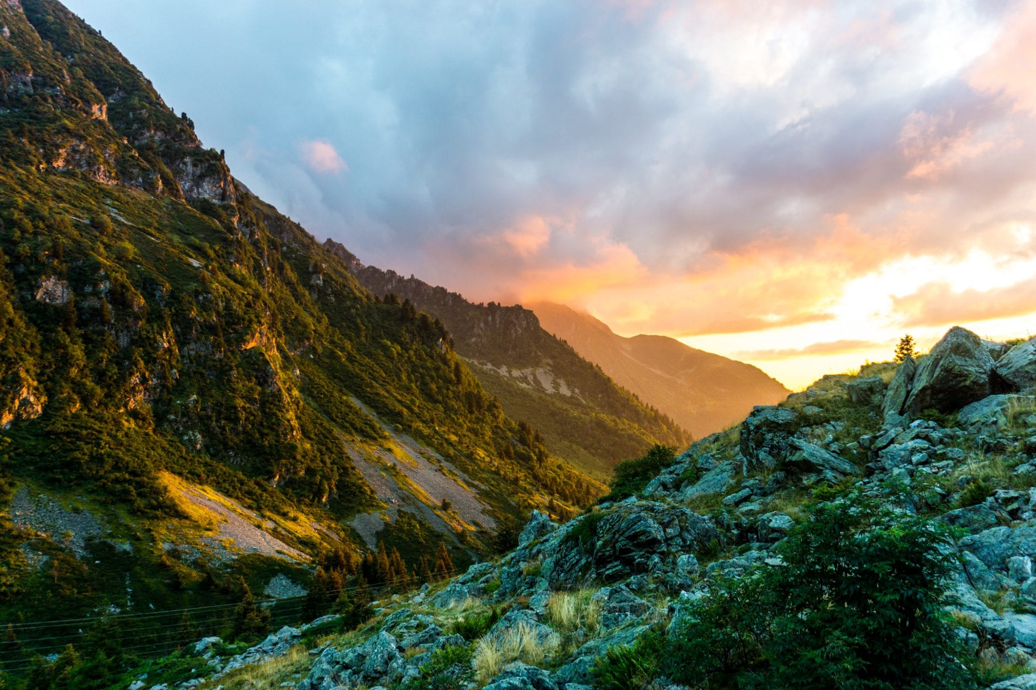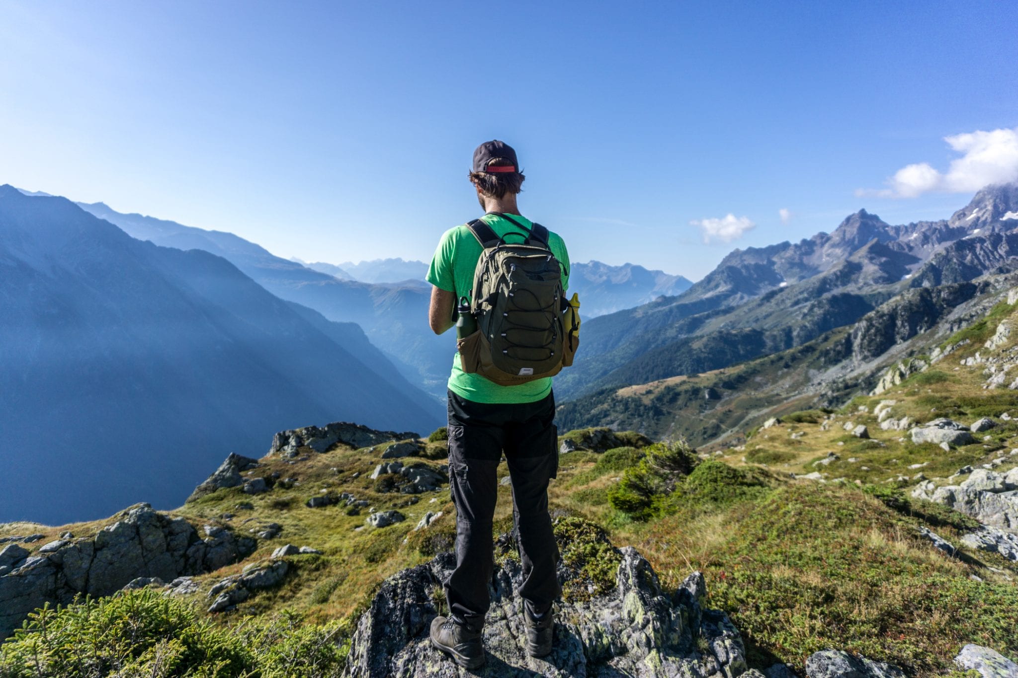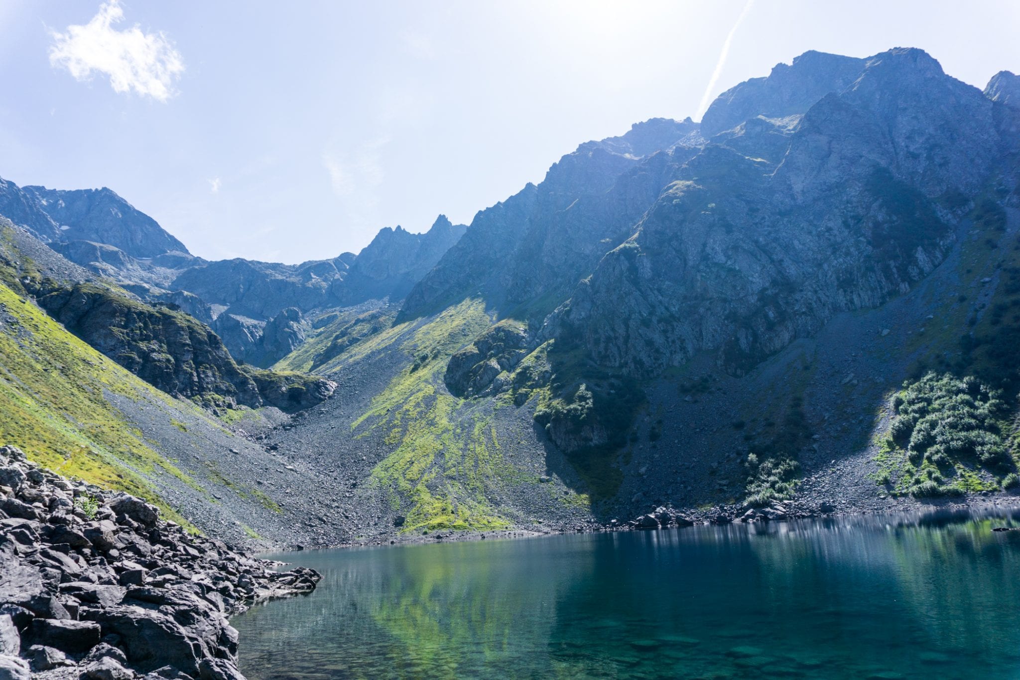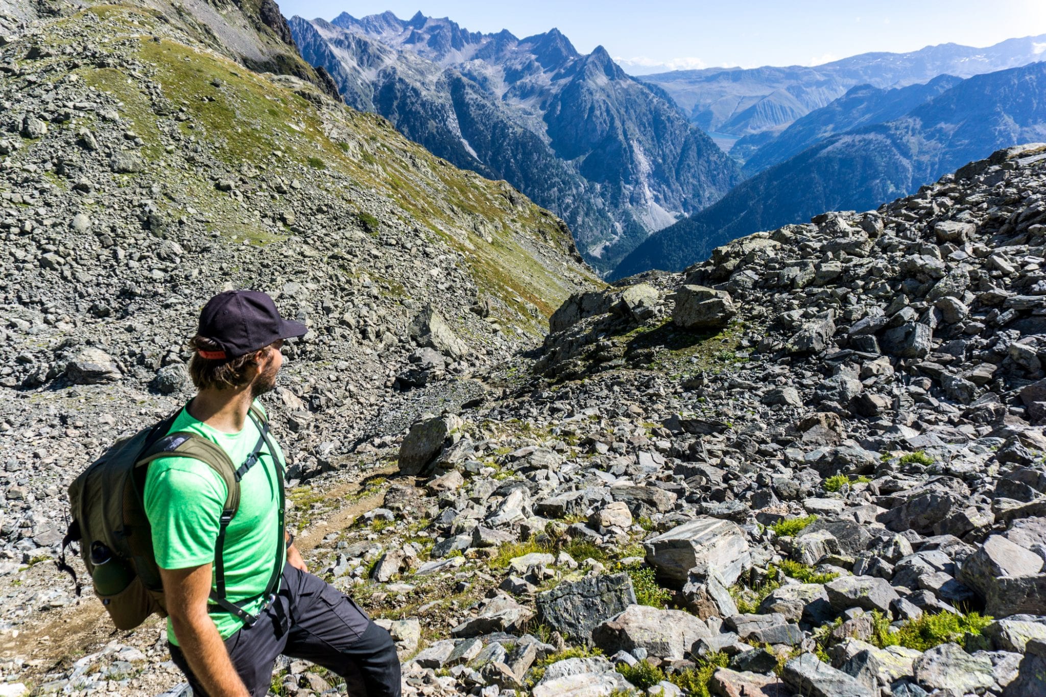 Om alvast een vliegende start te maken, trokken we op de vooravond van onze hike al naar de recent gerenoveerde hut Habert d’Aiguebelle. Een uurtje lopen vanaf parkeerplaats Pont de la Betta, in de buurt van Prabert. Vanaf de hut is het niet ver lopen naar Pas de la Coche, waar je kunt kiezen om de GR noordwaarts te lopen naar Refuge des 7 Laux of, net als wij, zuidwaarts te gaan. Maar voordat je een richting op loopt, wil je eerst even stilstaan om van het adembenemende uitzicht te genieten. Zo ver je kunt kijken zie je bergtoppen om je heen. Bij mooi weer en op tijd vertrekken zie je de vele kleurschakeringen en optrekkende nevel. Een geweldige view!