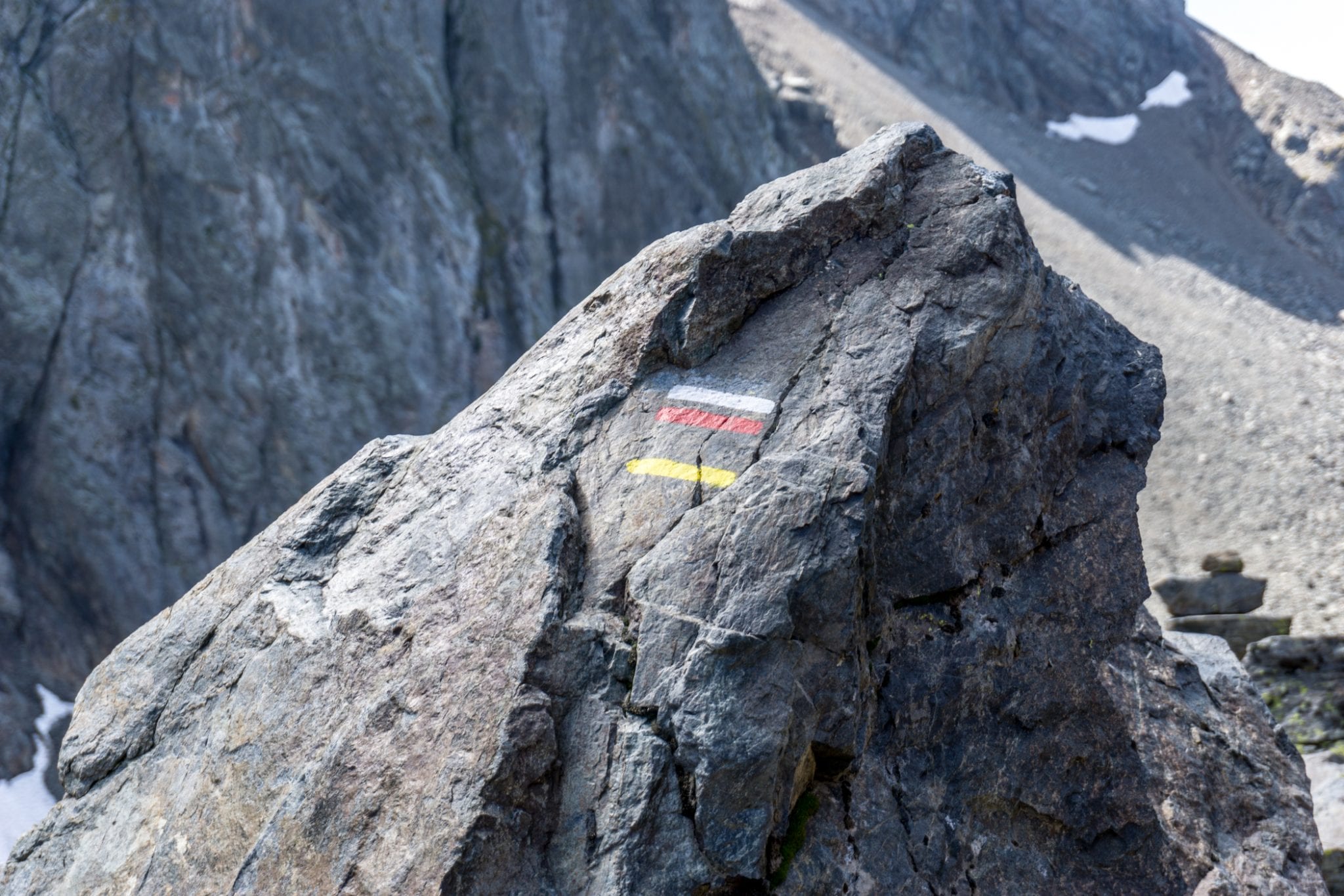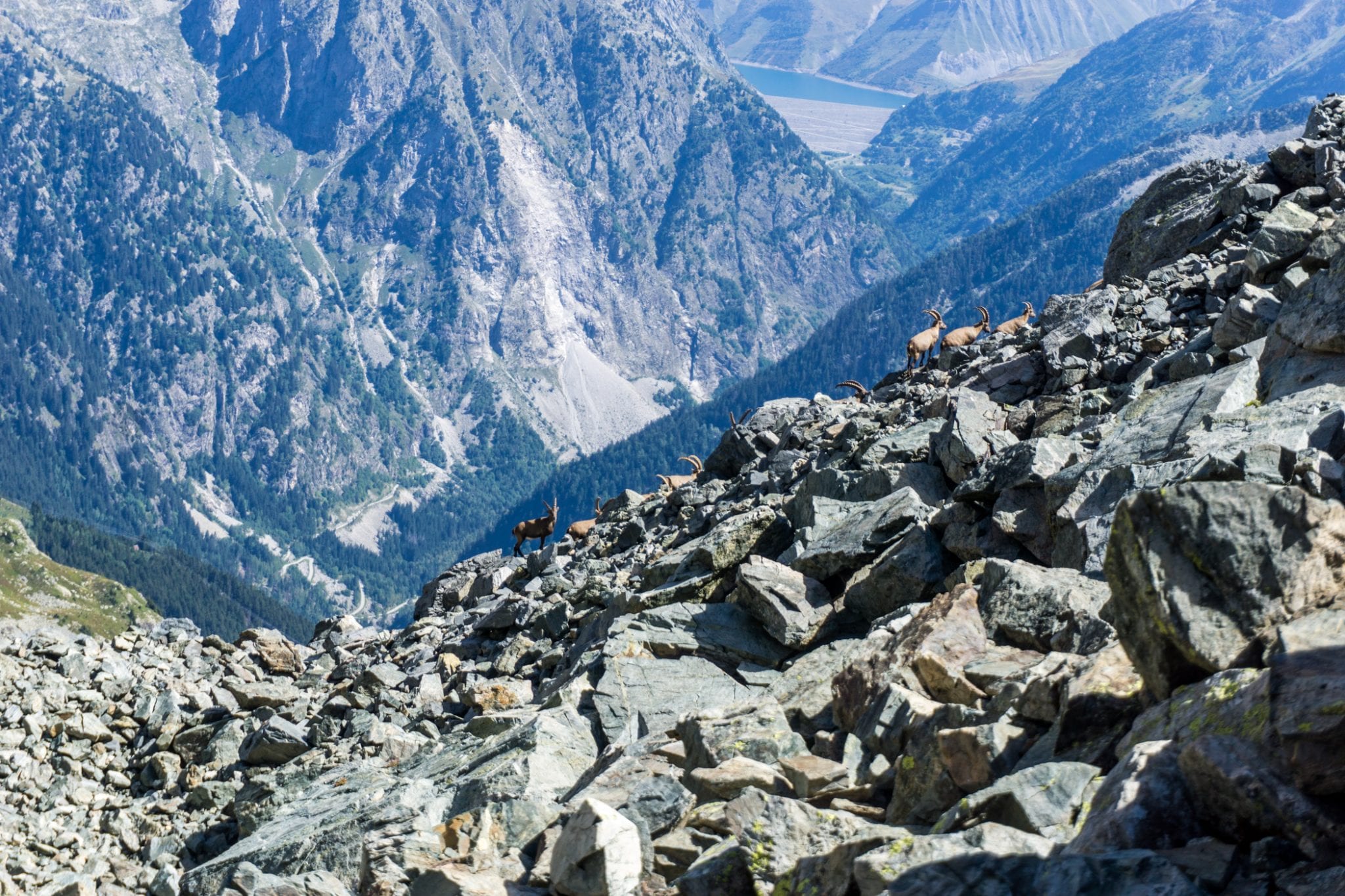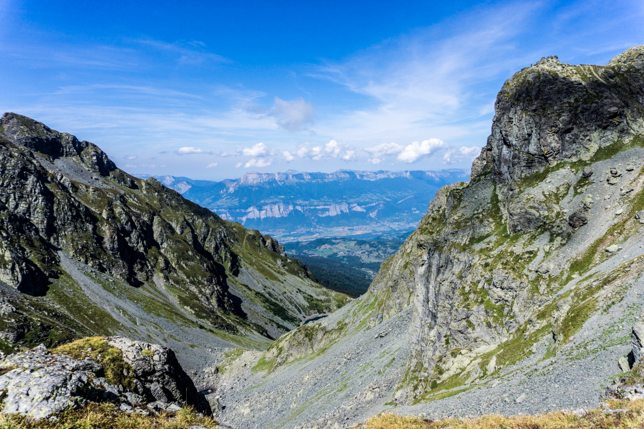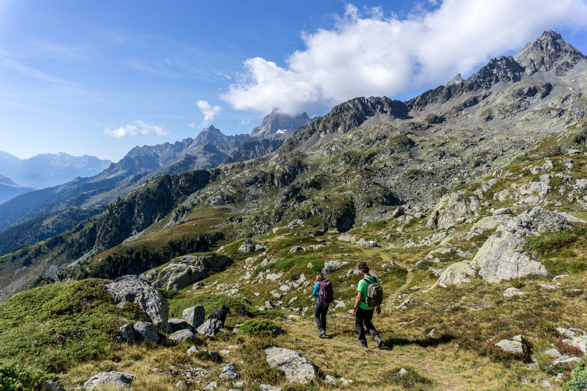 Vanaf Pas de la Coche loop je richting ‘la brèche de Roche Fendue’. De trail is te herkennen aan de rood-witte strepen, die in Frankrijk kenmerkend zijn voor een GR. Het pad varieert van goed beloopbaar door het gras tot aan slalommen op en over de rotsblokken, altijd vergezeld door het fantastische uitzicht op de bergtoppen om je heen. Met een beetje geluk kom je zelfs steenbokken tegen. Met een beetje pech kruis je een kudde schapen. Een beetje pech, omdat de schapen sinds een tijdje worden vergezeld door witte ‘Patou’ honden. Deze grote bollen wol zijn getraind om de terugkerende wolf en al het andere gevaar weg te houden bij de schapen. Ze zijn dus niet zo lief als ze eruit zien. Je wordt aangeraden om er met een grote boog omheen te lopen. Terwijl je dat doet, kijk vooral omhoog. Grote kans dat je enorme roofvogels ziet vliegen.